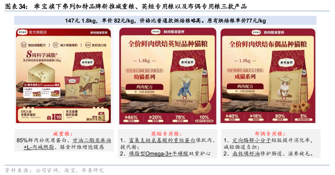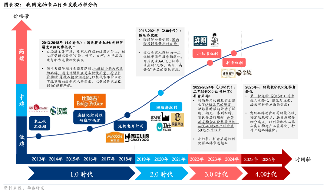 从历史复盘角度来看,早期中国宠物食品品牌的发展,主要得益于渠道更迭、消费结构变化和生产工艺升级的共同推动,现在已过渡到真正的研发实力竞争。早期,以比瑞吉、麦富迪、疯狂小狗为主的本土品牌抓住了淘宝、天猫等传统电商的流量红利,通过销售高性价比的犬粮完成了初步的规模积累,并通过高举高打的营销方式快速推动了国产品牌对进口品牌替代。随后伴随2020年后 “猫经济”的快速增长,催生了对“高鲜肉、高蛋白”的强烈需求。高爷家、卫仕、网易严选等品牌利用“配方全公开、肉源可溯源”的营销理念获得“成分党”消费者的信任,进一步打破了外资品牌的信任壁垒。近年来,面对传统膨化粮的同质化竞争,本土品牌如鲜朗、弗列加特等借助小红书、抖音等短视频平台的直观展示优势,推广“低温烘焙”等无淀粉、免喷油的新工艺产品。新工艺创新带动了整体国产品牌的高端化。而在当下,在烘焙粮价格内卷、工艺及产品微创新等背景下,以及伴随消费者的科学喂养理念不断深化,我们认为,聚焦特定功效的功能粮有望引领中国宠物食品行业的发展浪潮。宠物食品品牌的竞争重心,正从渠道布局、工艺创新,逐步转向以研发实力为核心的硬核竞争。