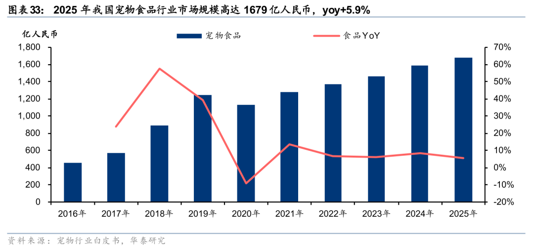 据白皮书数据,2025年我国宠物食品规模为1679亿人民币,若按照2024年美国处方粮及功能粮合计渗透率35%计算,则对应市场规模有望达到587亿人民币。据宠物白皮书数据,2025年我国犬猫市场规模为3126亿人民币,其中食品占比高达53.7%,市场规模为1679亿人民币。我们按照上文中2024年美国宠物食品市场处方粮、功能粮渗透率分别为8%、27%来估计,若我国宠物食品市场未来能够达到同等渗透水平,则对应的潜在市场规模有望高达134、453亿人民币,合计高达587亿人民币。头部企业如乖宝宠物已于近期推出体态管理粮、英短及布偶三款新品,中宠旗下小金盾“精准喂养系列”已升级为“功能烘焙”系列,头部宠企瞄准功能粮及处方粮赛道展开布局,我们看好该赛道未来发展前景。