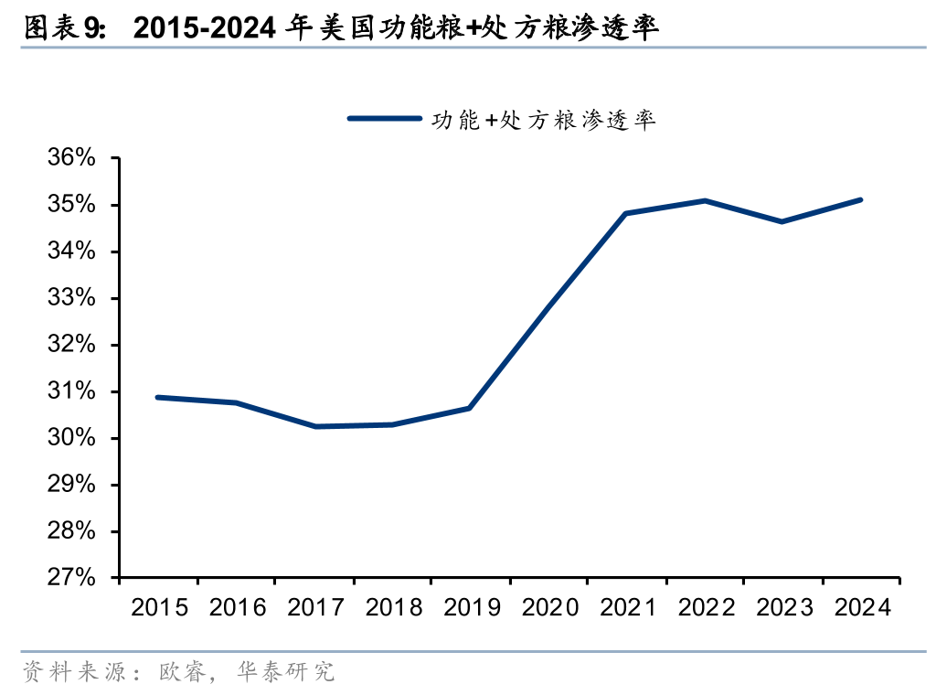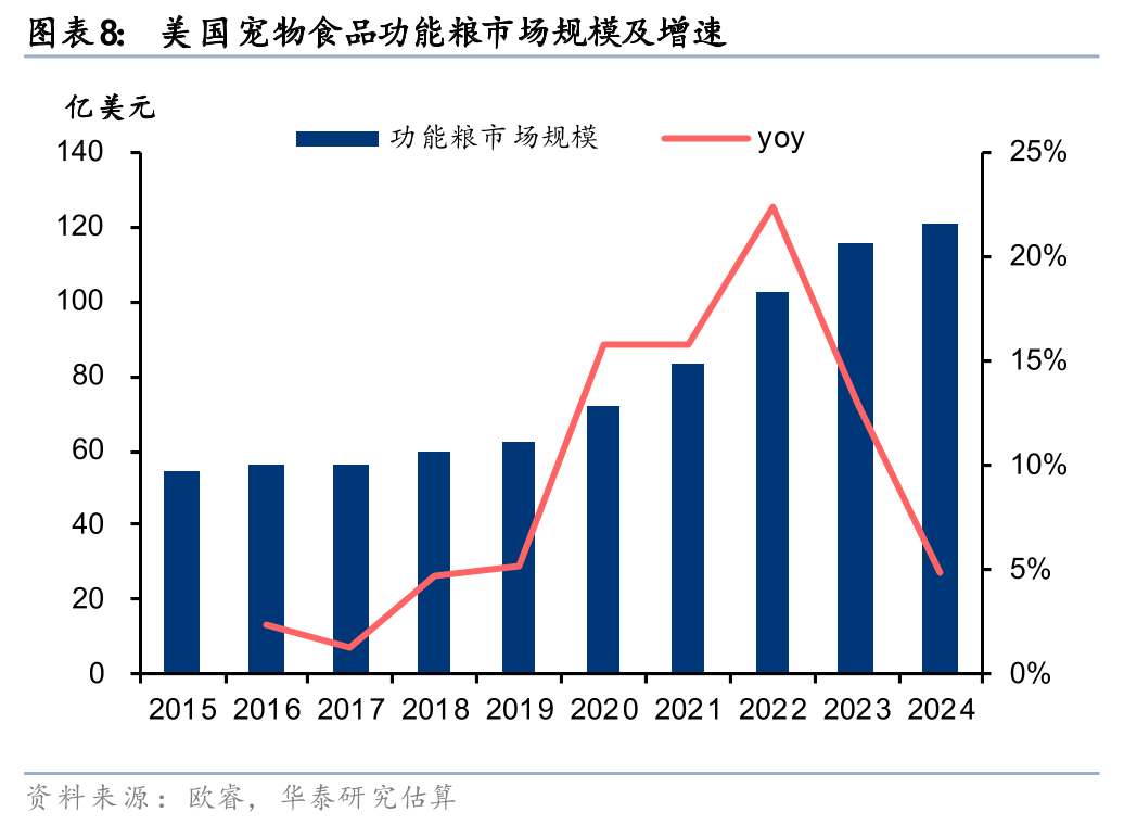 按照我们的筛选标准,我们估算2024年美国功能粮市场规模约121亿美元,占整体市场规模27%,2019-2024年CAGR为14.2%。结合大盘数据来看,2024年美国宠物食品市场总规模约为452.07亿美元,同期复合增速为10.6%。对比可见,功能粮赛道显著跑赢了行业整体大盘。此外,功能粮在美国宠物食品市场中的占比(渗透率)也呈现出稳步上升的态势,从2019年的23.6%提升至2024年的26.8%。这客观表明,在高度成熟的美国市场中,具备明确功效属性的细分产品正成为拉动行业规模扩张的核心动力,消费者对功能性产品的购买习惯和支付意愿已得到深度培育。我们此次的功能粮市场规模估算仅着重统计了功能性产品较为突出的品牌,若加上处方粮,二者2024年合计规模为158.6亿美元,占整体市场规模比例为35.1%。