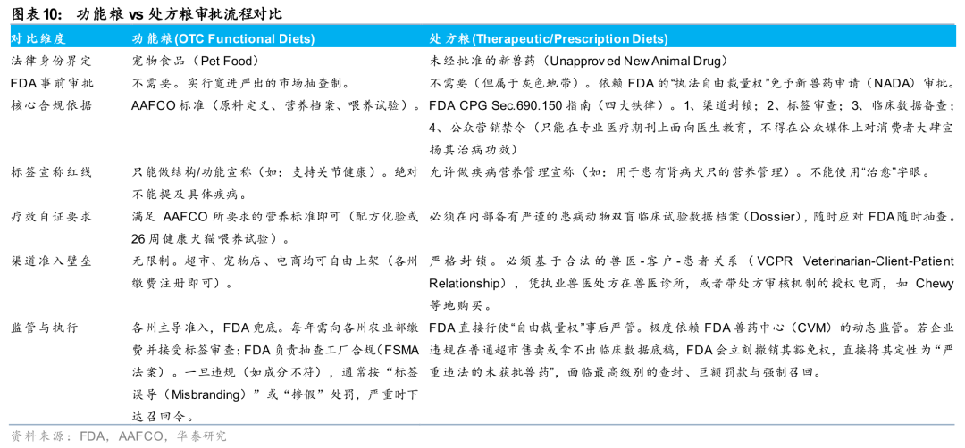 从审批流程角度来看,处方粮审批门槛更高,并且具备更高的渠道准入壁垒;功能粮隶属于“食品”范畴,其审批流程适用于全部的宠物食品。这背后是法律身份的不同:1、功能粮作为标准“食品”,无需进行FDA事前审批,只需满足AAFCO的原料与营养底线、严守绝不碰触疾病的标签红线,完成各州行政注册即可全渠道自由铺货,其审批流程适用于全部的宠物食品,功能粮在流程上并无差异。2、而处方粮因宣称可以干预特定疾病,所以在法律上属于“未经批准的新兽药”。其实际上走的是FDA“执法自由裁量权”的豁免通道,它同样无需官方事先盖章批准,但是代价是企业必须用严谨的患病动物双盲临床试验数据档案作为兜底备案,并且只能在兽医开具处方的专业渠道内购买,比如兽医诊所,或者带处方审核机制的授权电商(如Chewy)等。