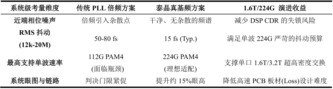 在1.6T(8x200G或4x400G)架构下,系统参考时钟频率上移至625MHz已是主流趋势。泰晶科技真基频技术避免了跨时钟域带来的不稳定因素,极大降低了DSP内部CDR(时钟数据恢复)失锁的风险。