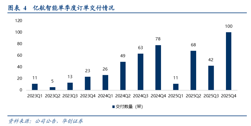 2025年全年共交付221架eVTOL产品,包括215架EH216系列产品与6架VT35飞行器;其中Q4交付量达到单季度最高的100架,包括95架EH216系列产品以及5架VT35飞行器。