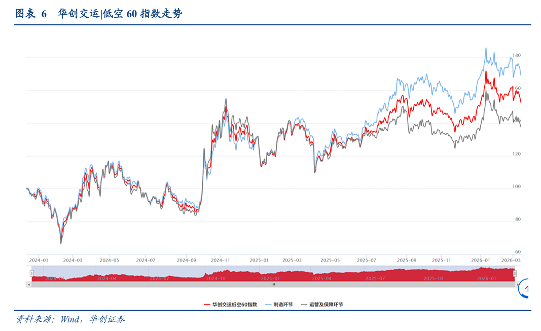 全年累计表现:华创交运|低空60指数上涨0%,其中制造环节下跌0.2%,运营及保障环节下跌0.4%。