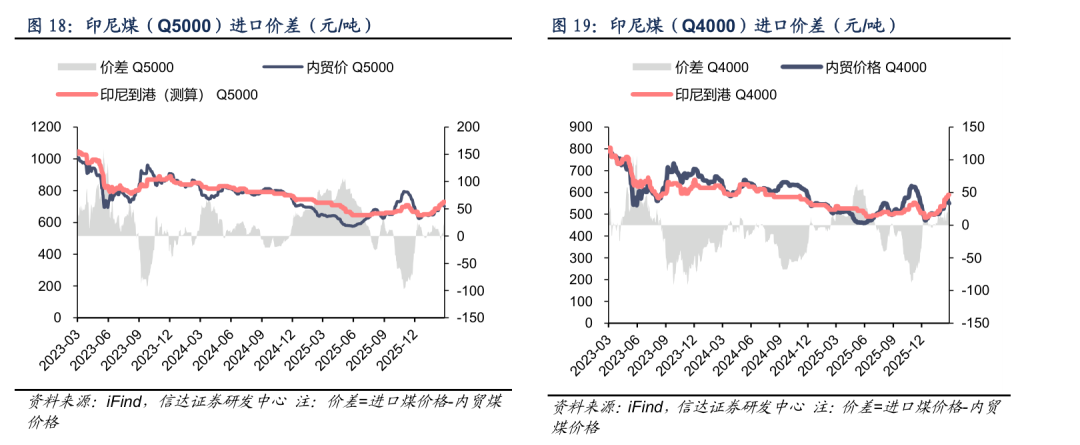 截至3月13日,5000大卡动力煤国内外价差27.4元/吨,周环比上涨22.6元/吨;4000大卡动力煤国内外价差39.5元/吨,周环比上涨19.9元/吨。