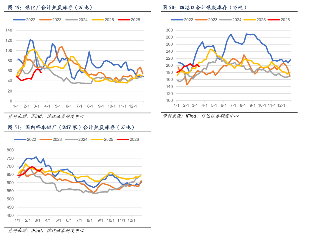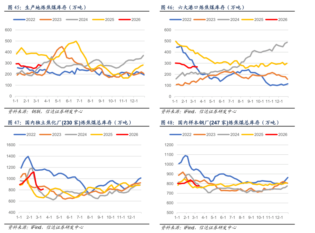 产地库存:截至3月13日,生产地炼焦煤库存较上周下降8.6万吨至277.7万吨,周环比下降3.00%。