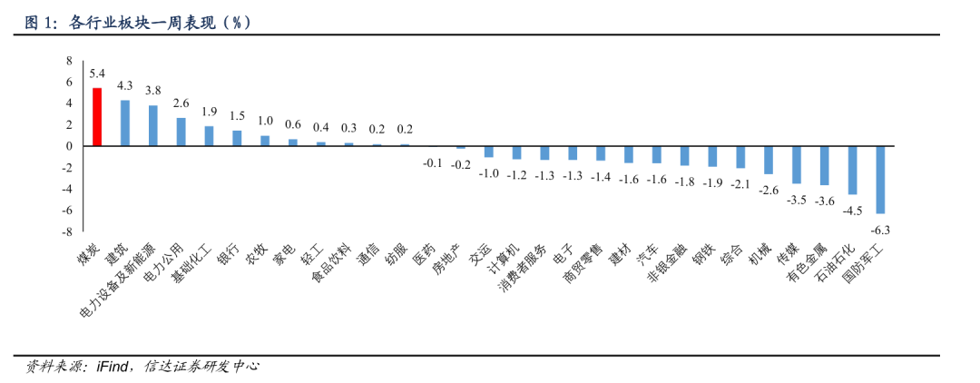 本周煤炭板块上涨5.42%,表现优于大盘;本周沪深300上涨0.19%到4669.14;涨跌幅前三的行业分别是煤炭(5.42%)、建筑(4.28%)、电力设备及新能源(3.79%)。