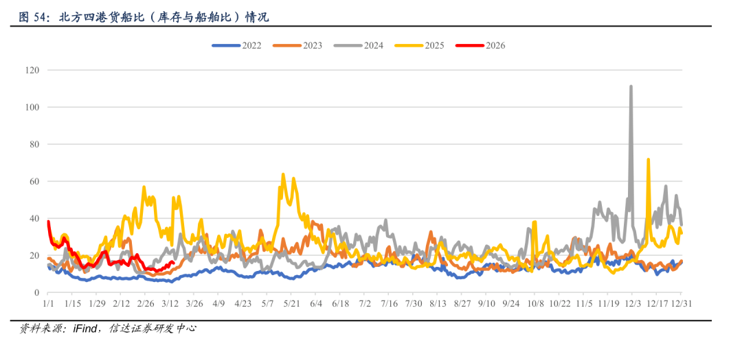 截至3月13日,环渤海地区四大港口(秦皇岛港、黄骅港、曹妃甸港、京唐港东港)的库存为1510.0万吨(周环比增加79.80万吨),锚地船舶数为55艘(周环比下降11艘),货船比(库存与船舶比)为27.5,周环比增加5.78。