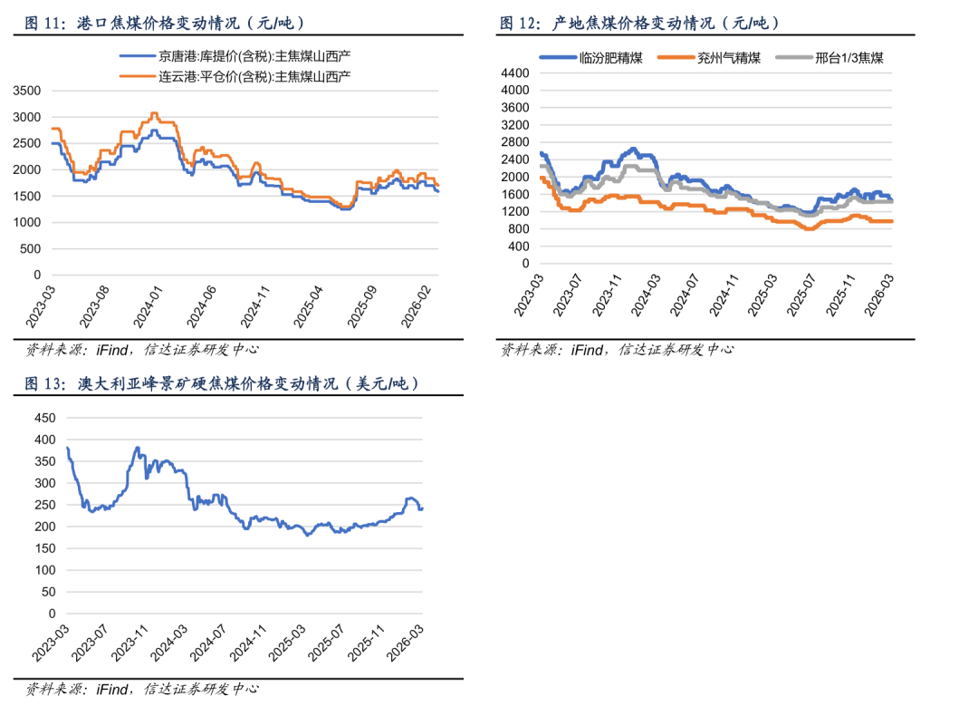 炼焦煤价格方面:本周京唐港价格周环比下降,产地临汾价格周环比下降。港口炼焦煤:截至3月13日,京唐港山西产主焦煤库提价(含税)1590元/吨,周下跌20元/吨;连云港山西产主焦煤平仓价(含税)1705元/吨,周下跌24元/吨。产地炼焦煤:截至3月13日,临汾肥精煤车板价(含税)1450.0元/吨,周环比下跌30.0元/吨;兖州气精煤车板价980.0元/吨,周环比持平;邢台1/3焦精煤车板价1430.0元/吨,周环比持平。国际炼焦煤:截至3月13日,澳大利亚峰景煤矿硬焦煤中国到岸价241.5美元/吨,周环比上涨2.5美元/吨。