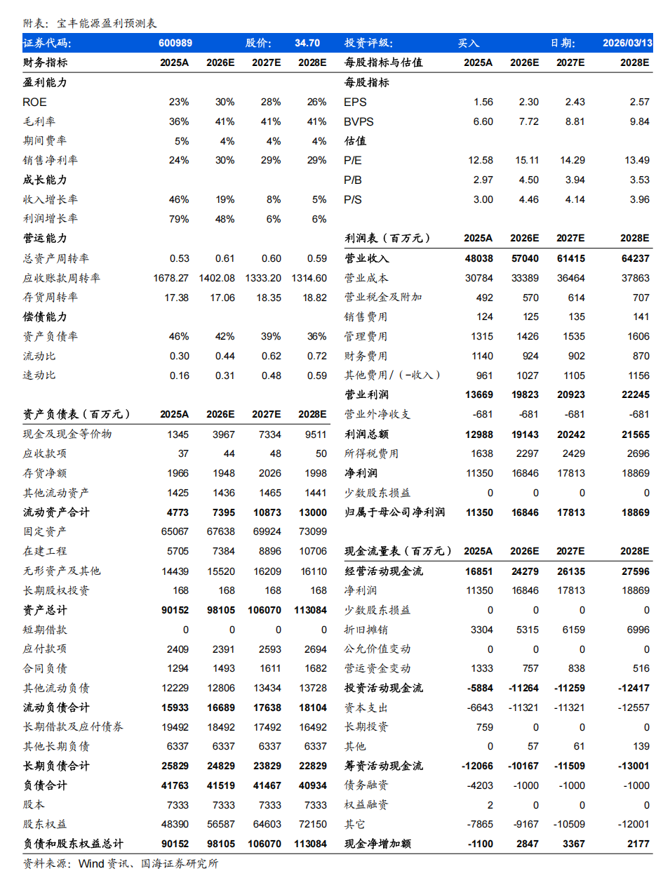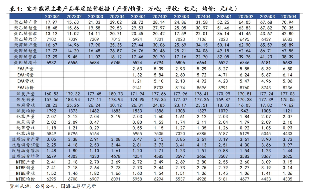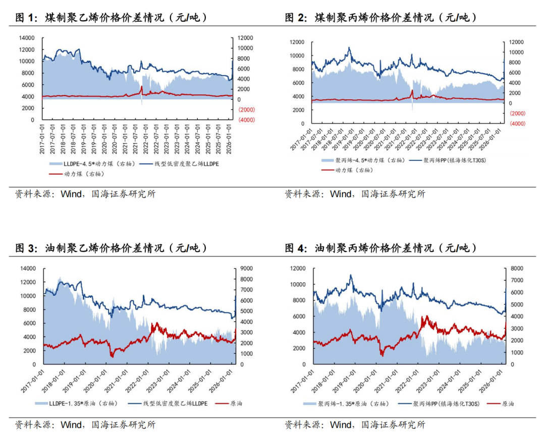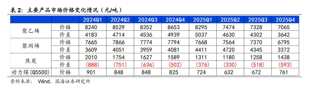 2025Q4,公司实现营业收入124.93亿元,同比 37.85亿元,环比-2.32亿元;毛利润39.91亿元,同比 12.53亿元,环比-8.88亿元;归母净利润24.00亿元,同比 5.99亿元,环比-8.32亿元。公司营收及利润同比增加,主要系聚烯烃产销量同比增长;营收及利润环比略有下降,主要受到四季度煤炭价格上涨影响。2025Q4,公司聚乙烯销量为70.35万吨,同比 127%,环比 4%;聚丙烯销量为67.55万吨,同比 98%,环比 1%;EVA销量为6.14万吨,同比 7%,环比 8%;焦炭销量为175.05万吨,同比-1%,环比-1%。据Wind数据,2025Q4聚乙烯均价为7065元/吨,同比-18%,环比-4%,价差为3642元/吨,同比-26%,环比-15%;聚丙烯均价为6795元/吨,同比-13%,环比-8%,价差为3372元/吨,同比-17%,环比-22%。原材料端,煤炭均价为761元/吨,同比-8%,环比 13%。期间费用方面,2025Q4公司销售/管理/研发/财务费用分别为0.35/3.50/2.26/2.80亿元,同比 0.01/ 1.28/ 1.54/ 0.96亿元,环比 0.10/ 0.20/-0.79/-0.15亿元。2025Q4公司营业外支出为1.95亿元,同比 1.13亿元,环比-0.14亿元。2026Q1,受到中东局势影响,原油及聚烯烃价格快速上涨,煤价相对稳定,油煤价差大幅走扩,看好公司2026年一季度业绩。据Wind数据,截至2025年3月13日,聚乙烯价格为8500元/吨,较年初 27%,价差5220元/吨,较年初 43%;聚丙烯价格为8600元/吨,较年初 32%,价差5320元/吨,较年初 54%。原材料端,据Wind数据,截至2025年3月13日,动力煤(Q5500)价格为729元/吨,较年初 8%。