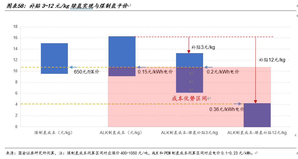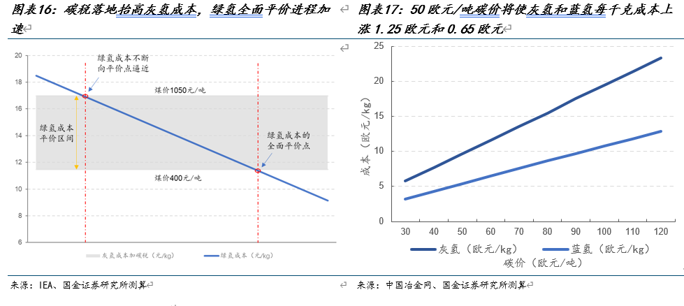 配套的碳税落地将带动绿氢的大规模应用时点提前。碳税落地将抬高原有能源使用成本,加速绿氢平价进程。欧盟碳税已于2023年10月开启试运行,2026年正式运行,碳税的落地将抬高原有灰氢成本,变相加速绿氢的平价进程。2022年欧盟平均碳价约为88.36欧元/吨,2023年平均碳价预计为97.66欧元/吨,每千克灰氢(煤制氢)约产生的25kg二氧化碳,以欧盟50、100欧元/吨的碳价测算,对应的灰氢成本将上涨9.7、19.3元/kg。