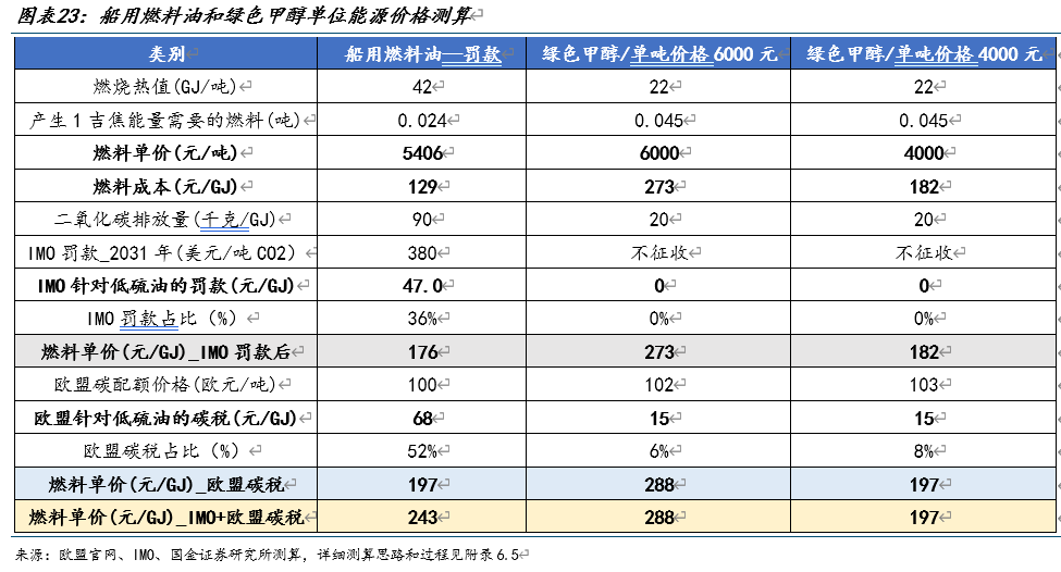 根据我们的测算,当欧盟碳配额价格在100欧元/吨时,对应考虑碳配额后的燃料单价为200元/GJ。此时若绿色甲醇燃料单价降至4000元/吨时,两类燃料使用成本基本持平。若单独考虑国际海事组织(IMO)罚款,则平价下对应的绿醇价格将提高至5000元/吨。