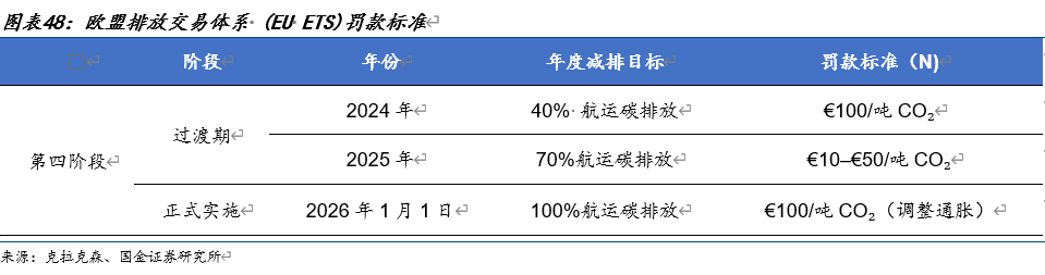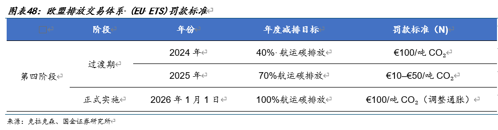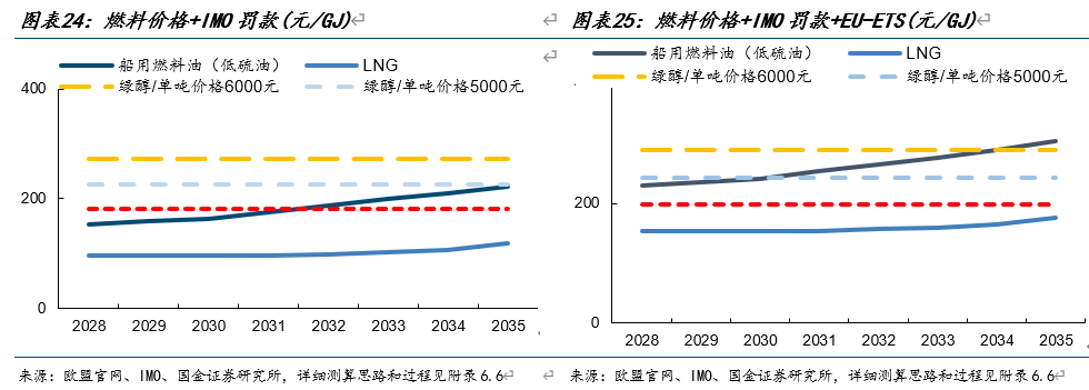 IMO政策31年绿醇迎经济性拐点,欧盟航线绿醇接受价格更高。欧盟罚款每5年发生一次阶跃,基于FUEL EU Maritime和EU ETS的罚款体系,当绿醇价格在6000元时,从2034年起绿醇较船用燃油开始具备经济性优势;当绿醇价格在4000元时,2035年之后绿醇综合成本优势较LNG开始显现。