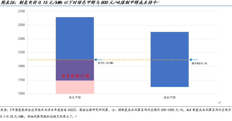 国内碳税或补贴将加速绿醇实现经济性,打开化工及航运需求。低电价下,绿色甲醇经济性开始显现。反应中使用绿氢,此方式生产出来的甲醇被称为绿色甲醇(电制甲醇)。根据我们测算,电价低于0.15元/kWh时,绿色甲醇将初步具备竞争力,此时将与煤价为800元/吨时的煤制甲醇生产成本基本齐平。