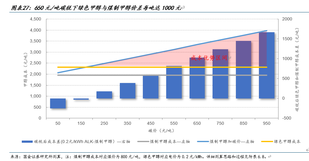 叠加碳税成本,加速绿醇经济性显现。煤制甲醇过程碳排放量为2.13吨/吨甲醇,传统煤制甲醇路线在征收碳税下,若碳价在50-100欧元/吨,按汇率EUR/CNY为7.8换算,则对应每吨煤制甲醇将额外支出390-780元,相较0.2元/kWh的绿色甲醇成本,650元/吨碳税下,两者差价达到1000元/吨,碳税加持下绿色甲醇成本优势开始逐步凸显。