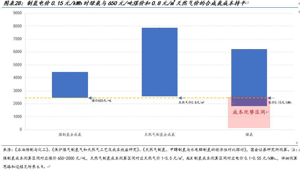 绿氨经济性可期,适用于替代工业传统领域高碳路线。低电价下绿氨可与传统合成氨路线的成本持平。当前碱性电解槽(ALK)制氢合成氨路线在0.2、0.15元/kWh度电成本、1.5元/W购置成本下,可实现与煤制氢合成氨(煤价950、650元/吨)、天然气制氢合成氨(气价1.2、0.8元/m3)的成本持平。