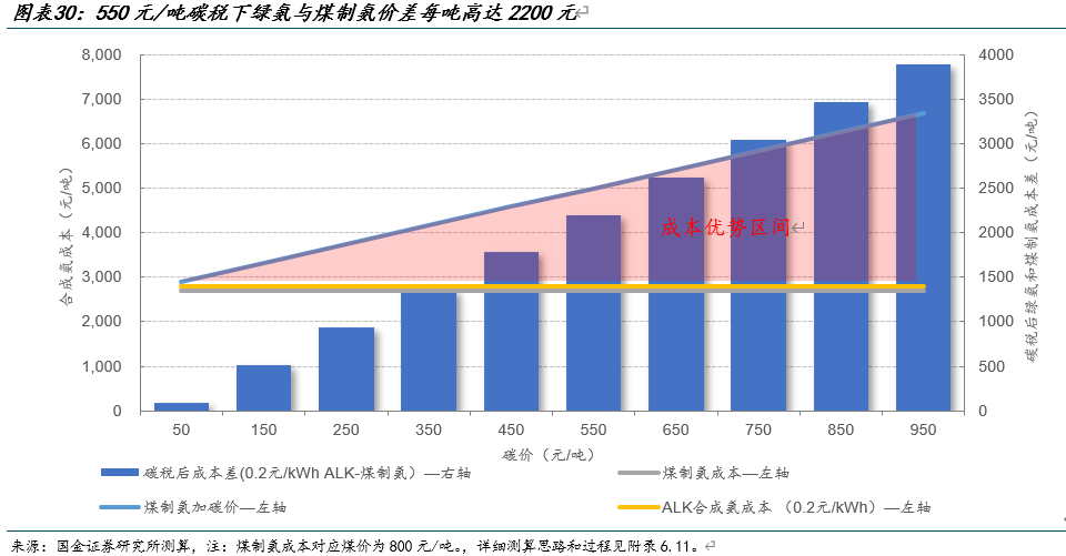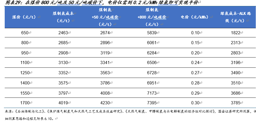 50元/吨碳税下,煤制氨生产成本上升约9%,800元/吨碳税下(以欧盟碳税100欧元/吨为基准换算),煤制氨生产成本上升137%,此时绿氢制氨具备明显成本优势。在煤价800元/吨左右,50元/吨的碳交易价格加持下,电价提升至0.2元/kWh时(无碳税时需0.18元/kWh),绿氨便可实现平价。