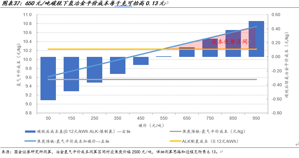 随着风光储等设备降本、绿电直连、氢能产业链成熟等,氢冶金经济性逐步可期。生产1吨铁需焦炭340 kg,二氧化碳排放量约1.25吨;生产1吨铁需氢气89 kg。以焦炭价格2500元/吨测算,不考虑碳税的情况下,平价时对应氢气的价格为9.6元/kg,当碳税为200元/吨,氢气成本低于12.4元/kg时,氢冶金才更具有成本优势。