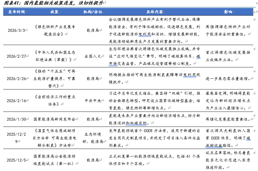 氢能正崛起为破解我国能源安全与深度脱碳双重困境的核心枢纽,战略高度与政策力度空前。一方面,能源安全压力凸显。2025年国内石油消费的43%、天然气消费的17%依赖中东及俄罗斯进口。霍尔木兹海峡承担着我国约40%的原油进口量,自伊朗进口的甲醇占比高达50%-60%。近期国际地缘政治动荡,使能源供应链的脆弱性进一步暴露。另一方面,脱碳进程步入深水区。工业、化工、交通等“难减排领域”已成为降碳攻坚的主战场,减碳目标正倒逼氢氨醇需求加速释放。根据2026年政府工作报告的单位GDP减碳目标,我们测算:2026年绿氢需求将达300万吨,带动电解槽约27.8GW;“十五五”期间绿氢需求将攀升至6500万吨,对应电解槽约602GW。氢能凭借能源燃料、工业原料和储能介质三重属性,已获得中央层面战略定调。随着绿电直连、取消过网费等政策红利落地,叠加欧盟碳税等外部机制抬高灰氢成本,绿氢平价进程正实质性提速。当新能源供电电价在长时稳定运行下降至0.2元/kWh以下,绿氢将大范围具备与灰氢平价的能力。作为未来国家能源体系的重要组成部分,氢能正站在规模化和商业化的历史转折点上。