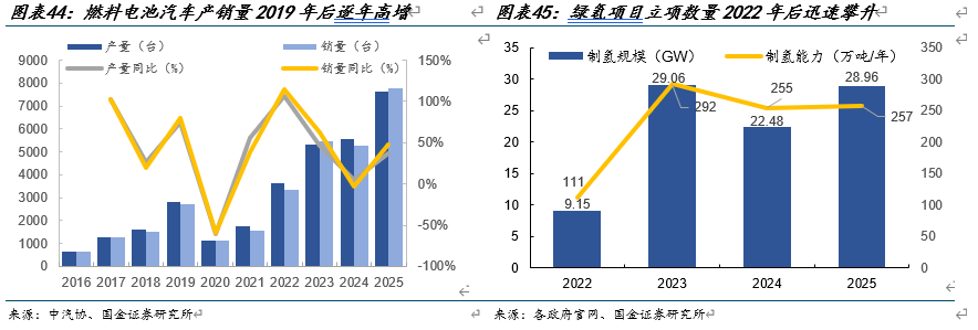 政策决定需求周期,量的爆发开启行情。现阶段氢能处于发展前期,需相关政策支持加速行业发展。回顾2017-2019年新能源汽车补贴政策实施和2021年氢燃料电池汽车示范城市群政策发布,均带动了燃料电池汽车销售量的高速增长,并且后者作为专门针对燃料电池汽车的示范和补贴政策,驱动力更强。2022年氢能中长期规划的出台则直接带动了氢能全产业链需求的爆发,绿氢需求2022年后迅速攀升,除燃料电池汽车外新带来上游制氢、中游储运和下游多个领域的投资机会。