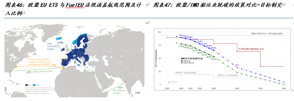 国际政策频繁出台,欧盟碳税和IMO政策推动航运向绿色化转向,带来绿醇第一波发展确定性。现阶段,欧盟航运业减碳需遵守EU ETS/Fuel EU,预计IMO减碳政策将于26年10月投票表决,通过后航运减碳将由欧盟拓展至全球航线。绿色航运需求由政策驱动,欧洲政策已与24、25年实施,船东为绿色转型,与上游端绿醇生产商签订合约,现阶段订单均为配套欧洲政策,不受IMO法案影响。