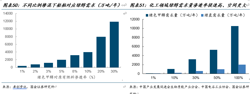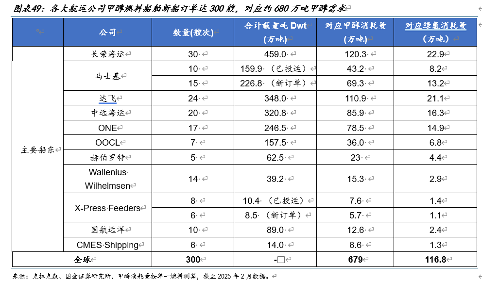 全球绿醇需求将超4000万吨,国内化工可打开千万吨需求。中长期看,2030年全球绿色甲醇需求量将超4000万吨,船舶将打通绿氢消纳通道。2023年报告的全球船队(5000总吨以上)的燃料总消耗量为2.11亿吨,以船用燃油燃烧热值为42GJ/吨和绿色甲醇热值22GJ/吨,以及在成本最优的情况下,若2028-2030年按热值掺混绿醇3-10%不等的情况下,全球绿色甲醇需求量最高超过4000万吨(掺混10%以上)。工信部正在制定的《船用绿色燃料发展路线图》也明确,2030年中国船舶绿色甲醇燃料占比需超15%,这意味着国内每年至少500万吨的市场缺口。