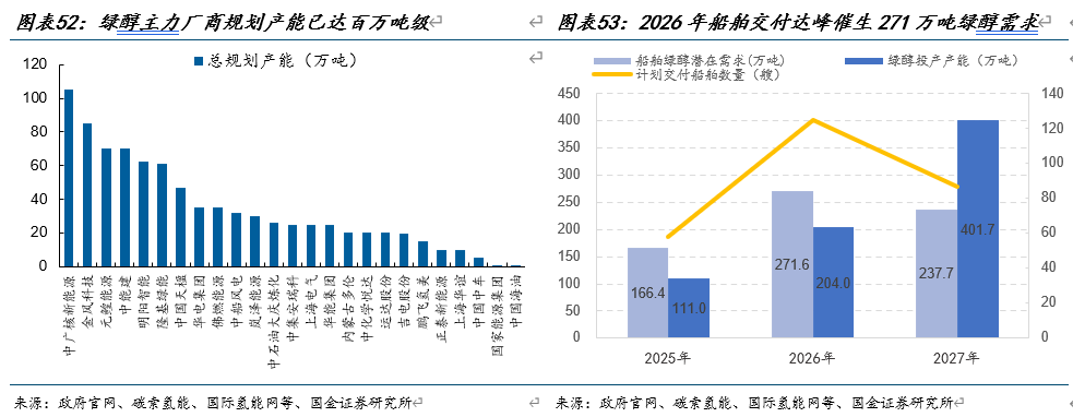 绿醇领域:海外碳税催化平价加速,国内低电价 补贴加持经济性。根据我们测算,当欧盟碳配额价格达100欧元/吨时,绿醇价格降至4000元/吨即可与传统船用燃料成本持平。国内方面,电价低于0.15元/kWh时,绿醇可与煤制甲醇平价;叠加50-100欧元/吨碳税后,经济性进一步凸显。政策端,欧盟碳税及IMO法案正推动航运绿色化加速——短期看,439艘甲醇船舶投运将带来超1107万吨需求;中长期看,全球绿醇需求有望超4000万吨(10%渗透率),国内化工领域30%替代可再打开3000万吨市场。未来2-3年绿醇供不应求格局明确,建议优选投产早、需求确定性强、成本控制能力突出的生产商。