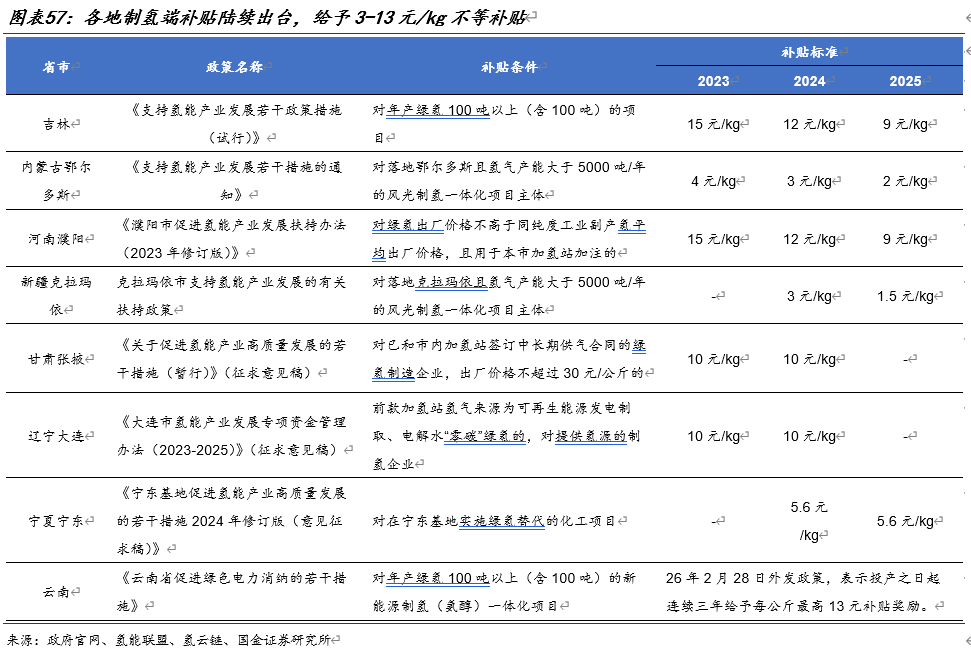 绿氢拥有单吨补贴时,平价可期。“十四五”期间,多省市出台绿氢电价优惠、绿氢制造与生产等补贴政策,内蒙古、甘肃、吉林、新疆、大连给予3-12元/kg不等的绿氢补贴,但大多在25年即到期。“十五五”开端之年,26年2月28日,云南省下发《云南省促进绿色电力消纳的若干措施》,明确表示“对年产绿氢100吨以上(含100吨)的新能源制氢(氨醇)一体化项目,投产之日起连续三年给予每公斤最高13元补贴奖励”,此补贴下绿氢将直接与煤制氢平价,扫除行业最大发展障碍——经济性,使绿氢项目建设大幅提速。