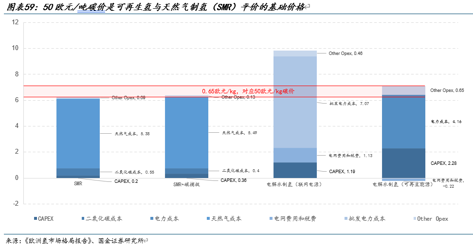 碳税政策抬高原有能源使用成本,加速刺激绿氢需求增长。当前可再生氢在部分欧洲国家实现了与传统方式制氢的平价,碳税落地则是进一步推动可再生氢平价范围的扩大,对于依赖化石燃料生产的灰氢和蓝氢,碳税的实施将直接抬高原有生产成本。50欧元/吨的碳价是可再生氢实现平价的最低价格,当前欧盟EU-ETS交易碳价为65欧元/吨,并且长期看碳交易需求上升将会带动碳价上涨。