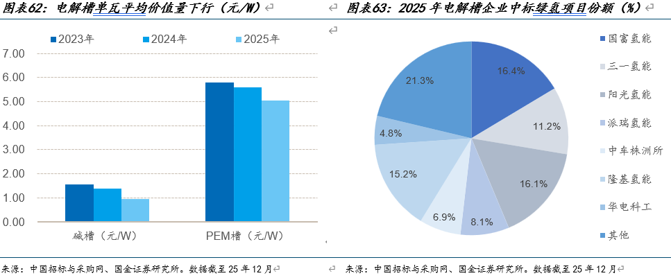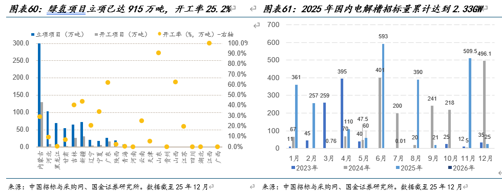 政策驱动 经济性可见度高 应用场景跑通,绿氢项目将迎开工潮,带来设备招标量提升。2023年-2025年,大量绿氢项目开始申报立项,截至2025年12月,落地项目产能约17万吨,立项项目的绿氢产能达915万吨,但开工率仅为25.2%。存在开工率低,业主方多观望的现象。核心问题集中在:项目经济性、政策指引和应用场景上。根据上文分析,此些问题目前基本均已得到解决,绿氢项目开工率的提速可预见。从项目立项到开工再到制氢设备招标一般需要1~2年时间,预计绿氢示范项目的大量开工,将带动制氢设备需求成倍数高增。