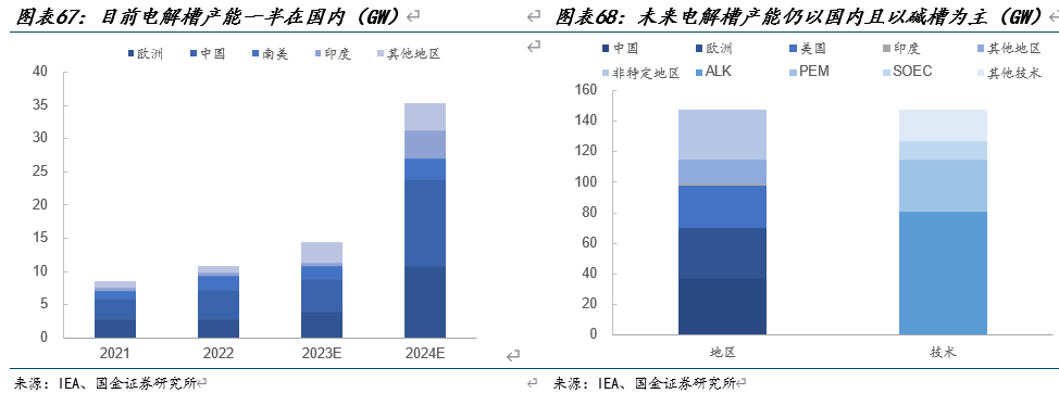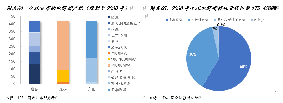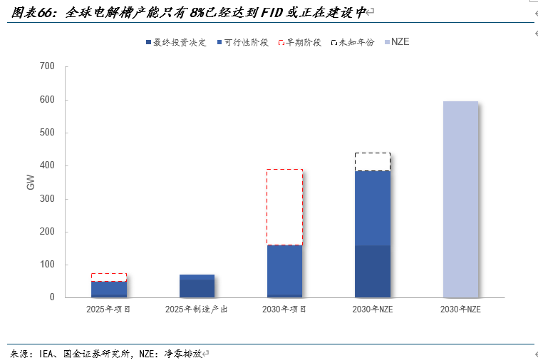 电解槽向上突破空间成倍数增长。IEA公布的产能中,目前只有8%已经达到FID(最终投资决定)或正在建设中,并且约30%是现有工厂的扩建,但暂未公布具体落地的年份。由于与新建工厂相比,计划扩建现有工厂的完成时间通常更短,企业拥有更长时间决定是否推进计划,若下游氢气需求超预期,则将带动大量项目落地。