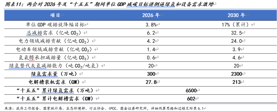 2025年氢能顶层关注度显著提升,国家层面政策频出、定调持续走高。相比“十四五”,“十五五”氢能产业发展面拥有强的政策迫切性与更完备的基础设施支撑。能源革命进入下半场——非电领域深度脱碳,氢氨醇作为关键载体不可或缺,产业链正迎来系统性发展机遇。根据我们对2026年政府工作报告提出的单位GDP降碳目标的量化测算,2026年绿氢需求将达300万吨,“十五五”期间累计需求有望攀升至6500万吨,需求端量级已明确。投资窗口期已然打开,建议重点布局率先跑通经济性、需求确定性强、政策密集度高的三大方向: