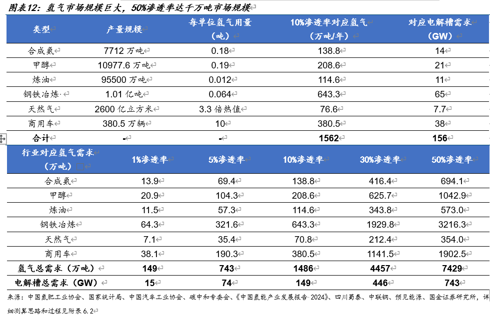 从需求看,绿氢应用将从价格敏感度最低的交通和化工领域打开,向工业、储能等渗透。氢能行业在十四五期间处在探索阶段,产业链“从0到1”逐步搭建,形成了发展的基础,同时相关设备价格也实现了大幅下行。应用场景涵盖绿色航运、氢能重卡到化工、冶金、储能等,渗透率达到10%情况下,氢气和制氢设备的市场空间将达到千亿。