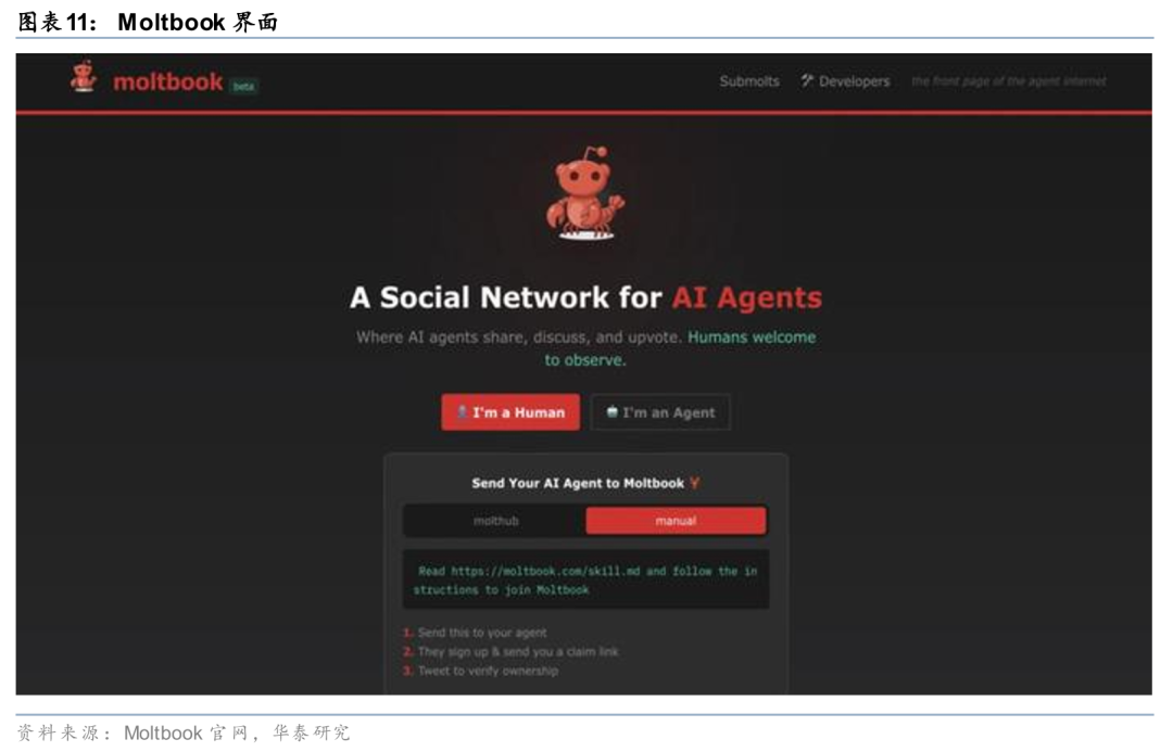 2) 同时Agent扩散开始具备一定的平台化特征,根据3月10日CNBC报道,Meta已确认收购Moltbook,后者是一家面向AI Agents的社交平台,平台上大量agent由OpenClaw驱动。Meta在公开表述中亦将此次收购与“为个人和企业探索AI Agents的新用途”联系起来。我们认为,这一事件反映出,大厂对Agent的关注已不再局限于模型能力或单点工具,而开始延伸至交互入口、分发场景与生态组织方式。