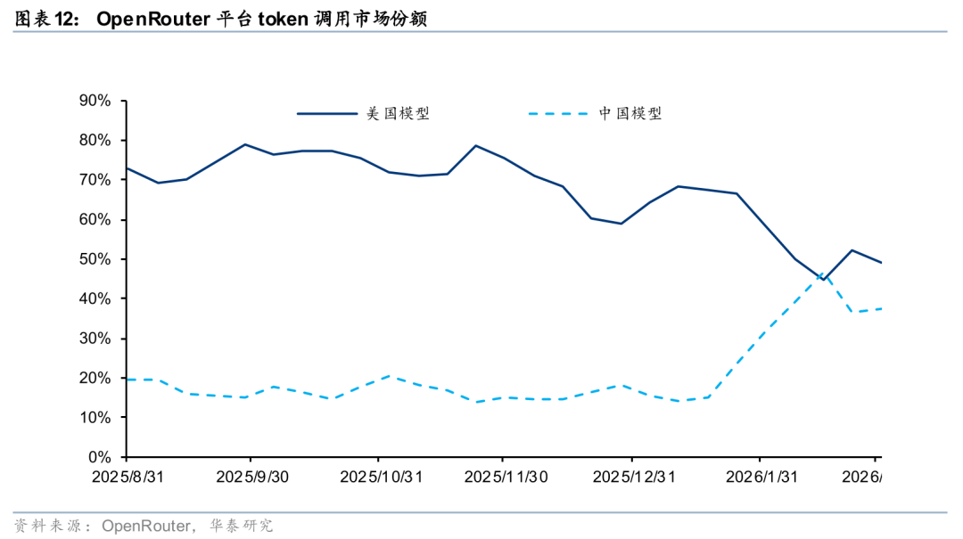 模型层已出现高端模型拼性能、二线模型拼性价比的格局。海外开发者、初创企业切换至中国模型实现Token出海,而目前OpenClaw单次任务Token调用海量,中国模型有望凭借极致性价比优势持续扩大份额,Token出海趋势有望延续,带动国内算力需求Beta持续向上,行业景气度将从核心算力芯片向AIDC、云与算力服务、配套电力设备及服务器等环节全面外溢。