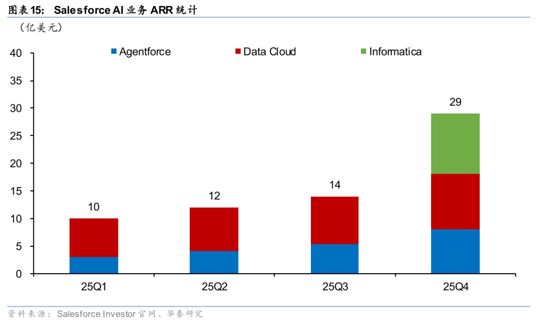 中台化转型初见成效,Agent数据环比加速。海外SaaS加速产品中台化转型,加速推广企业级数据中台、Agent管理平台等中台型产品。我们认为,中台产品有望成为企业级Agent运行的基座,率先实现中台化转型的厂商有望在AI时代占领较大的先发优势与卡位优势。以Salesforce为例,公司AI业务统计口径包括Data Cloud数据中台、Agentforce应用以及Informatica数据服务(25年收购)三类,25Q2-25Q4 Data Cloud ARR环比增速分别为14%、8%、16%,在中台产品逐步导入的基础上,Agent数据呈加速趋势,25Q2-25Q4 Agentforce ARR环比增速分别为33%、35%、48%。我们认为,25年海外SaaS中台化转型初见成效,已完成初步的客户覆盖,看好26年中台基础下的Agent应用放量。