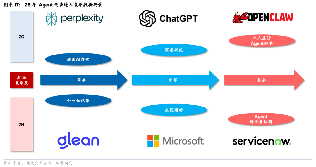 Agent进入复杂数据场景,AI新终端有望创造新数据来源。Agent能力边界拓展与数据访问权限高度相关,2C、2B Agent均逐步进入复杂数据分析场景。1)2C:OpenClaw提供个人Agent的复杂场景案例,用户可通过API配置或Skill调用,拓展“龙虾”的数据访问权限,执行更复杂的任务;2)2B:ServiceNow等软件厂商推出企业Agent平台,通过跨业务系统的数据打通,实现企业Agent的协同编排。我们认为,Agent能力拓展仍需要更多维度的数据拓展,AI眼镜、AI胸针、AI戒指等新AI终端有望成为Agent的数据获取来源,26年大厂的AI终端进展有望加速。以Limitless AI(AI吊坠形态,25年12月被Meta收购)为例,可无感收集用户佩戴时的所有音频信息,实现对话记录、摘要生成等功能,若此类数据进一步成为Agent数据源,个人Agent可执行的任务复杂度有望再度提升。