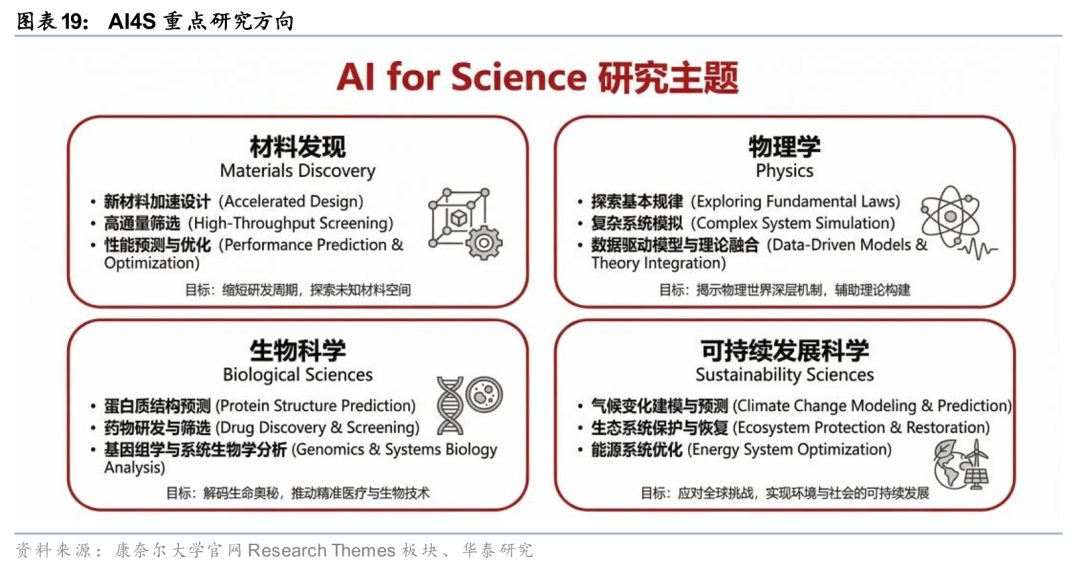 我们认为,AI for Science正从单点辅助工具加速演进为重构科研与产业研发范式的底层能力,在生物医药、材料科学与物理系统等方向持续打开应用空间。在AI制药环节,我们持续看好其在2026年的商业化前景,随着技术边界的拓展与产业化验证的深入,行业将迎来加速发展。此外,我们预计2026年有望成为物理AI加速发展的关键阶段,英伟达、谷歌加速物理AI布局,推动物理AI从实验室走向产业化落地。