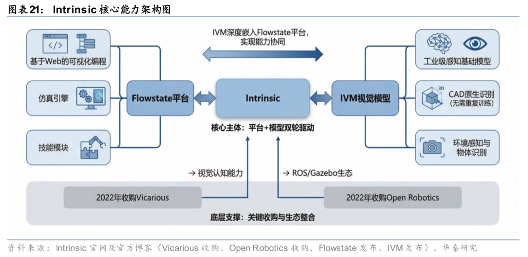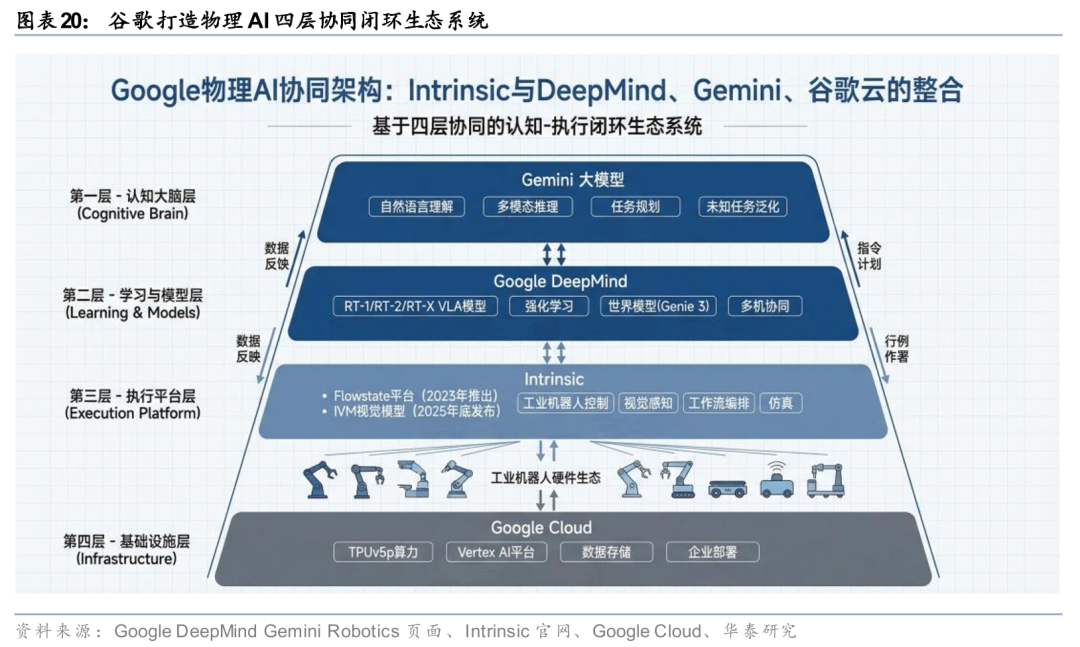 谷歌正通过战略重组构建物理AI时代的核心基础设施。2026年2月25日,Alphabet旗下工业机器人软件公司Intrinsic正式并入谷歌,标志着谷歌从AI算法研发向实体产业操作系统延伸的关键跃迁。此次整合将Intrinsic的工业机器人控制平台与谷歌 DeepMind的顶尖AI研究、Gemini大模型及谷歌云服务深度耦合,旨在为分散的工业机器人市场打造统一的、高度自适应的“安卓系统”。物理AI将从实验室走向规模化产业应用,重塑全球工业自动化的竞争格局与价值链条。谷歌将“机器人执行平台、前沿模型研究、通用多模态大模型、云基础设施”正式收束到同一套物理 AI 软件栈中。从能力分工来看,Gemini承担认知与任务理解,谷歌DeepMind承担机器人学习、VLA 模型与世界模型研究,Intrinsic承担工业机器人控制、视觉、仿真与工作流落地,谷歌云承担算力、部署、数据与企业连接。Gemini 和 DeepMind 的能力向下传导,赋予机器人系统语言理解、视觉推理、策略泛化和动态规划能力;另一方面,Intrinsic 在真实工业环境中获取的感知、任务和执行反馈,又能够通过谷歌云回流,用于模型训练、仿真优化与部署更新。通过四层架构的搭建,形成一个覆盖感知—理解—规划—执行—反馈迭代的完整“物理 AI 闭环”。