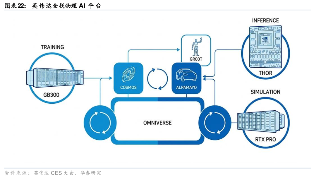 英伟达全栈物理AI平台已形成"训练-仿真-推理"三位一体的完整技术闭环。在训练层,以GB300为代表的AI超级计算机为海量模型提供算力底座,支撑复杂物理AI模型的深度学习;在仿真层,RTX PRO专业显卡构建高保真虚拟环境,通过精确物理模拟生成合成数据,构成物理AI研发的基础支撑;在推理层,THOR芯片专为汽车、机器人及工厂边缘场景设计,实现毫秒级实时决策与自主控制。英伟达物理AI战略在2026年全面走向成熟,打通从云端训练到边缘部署的全链路,为机器人灵巧操作、自动驾驶感知决策、智能工厂运营优化等多元场景提供端到端的技术基础设施,加速物理AI从实验室走向产业化落地。