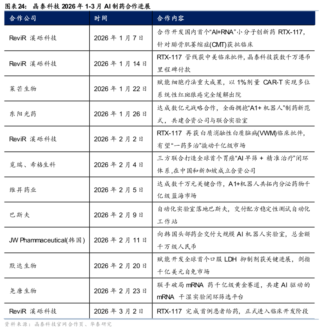 从商业化进展来看,各大型药企合作持续深入,AI制药领域商业化合作持续加速。2026年1月26日,晶泰控股与东阳光药达成数亿元战略合作,共建 AI 机器人联合实验室与非临床药物大模型,实现底层技术与新药管线开发及商业化的全方位合作。同时,晶泰控股孵化企业溪砾科技(ReviR)的创新药管线RTX-117成功实现中美双地IND获批,晶泰收到数千万港币里程碑付款,3月2日,RTX-117完成首例患者给药,正式进入临床开发阶段。
