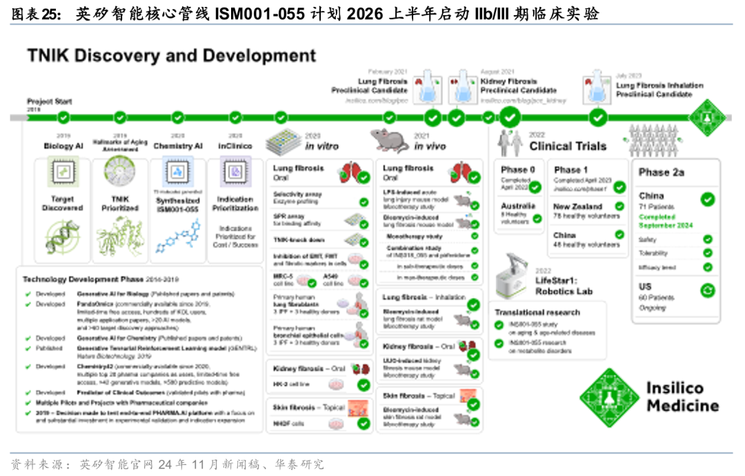 我们持续看好AI制药在2026年的商业化前景,随着技术边界的拓展与产业化验证的深入,行业将迎来加速发展。AI技术加速向小核酸、RNA疗法、细胞治疗等前沿领域渗透,不断拓宽创新药研发边界,为行业开辟第二增长曲线。技术纵深与新领域拓展的并进态势,正重塑药物发现的底层逻辑。临床与产业化验证正成为行业发展的核心主线。晶泰控股合作管线已进入规模化临床验证阶段,英矽智能核心管线ISM001-055作为全球首款由AI发现靶点并设计的小分子抑制剂,也即将在2026上半年启动IIb/III期关键临床研究。