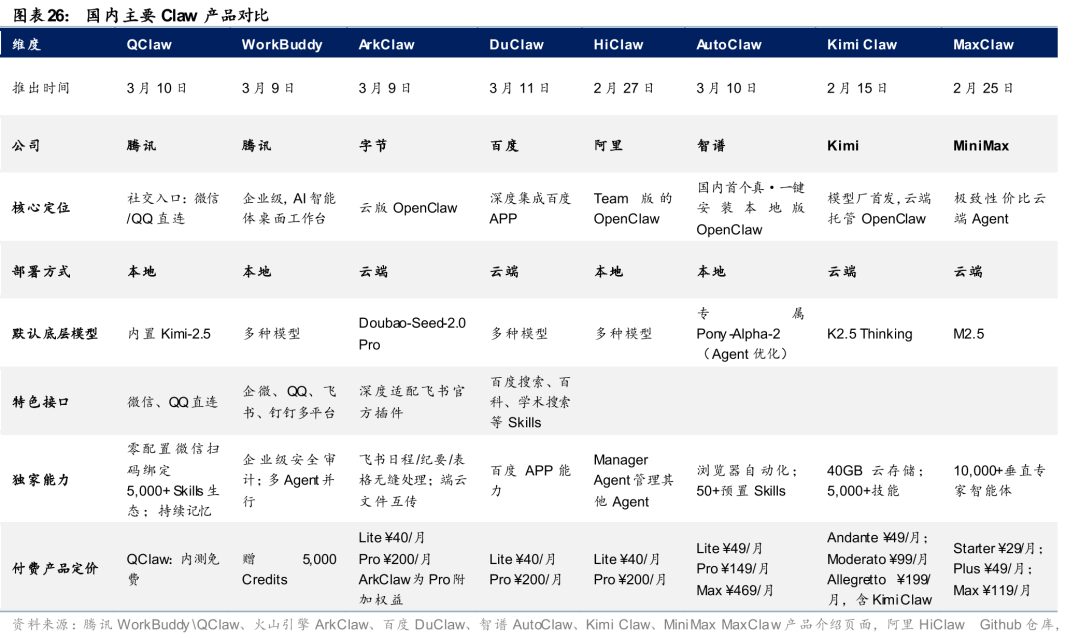 在共性基础之上,各家产品沿云端、本地、平台级产品分化。第一类是云端托管路线(如ArkClaw、DuClaw、Kimi Claw、MaxClaw),主打7×24小时在线、关机后任务仍在云端执行,适合需要持续自动化的场景,但数据流经云端。第二类是本地部署路线(如AutoClaw、QClaw),强调数据不出设备、隐私可控,面向安全敏感型用户。第三类是平台级封装路线(WorkBuddy),我们认为产品形态比较接近Claude推出的Cowork,在具备一定AI执行能力的基础上,叠加企业级安全审计和多平台协同,安全性更强。