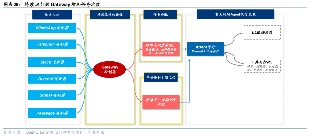 任务次数的增加源于Gateway设计。Gateway可以理解为一个持续运行的线程,正是Gateway使得OpenClaw可以完成需要持续工作的任务和定时任务,而此前的AI一般需要对话才能激活使用。从AI调用上来看,此前的AI是人为线性调用的,而OpenClaw则是Gateway控制下并行调用的。