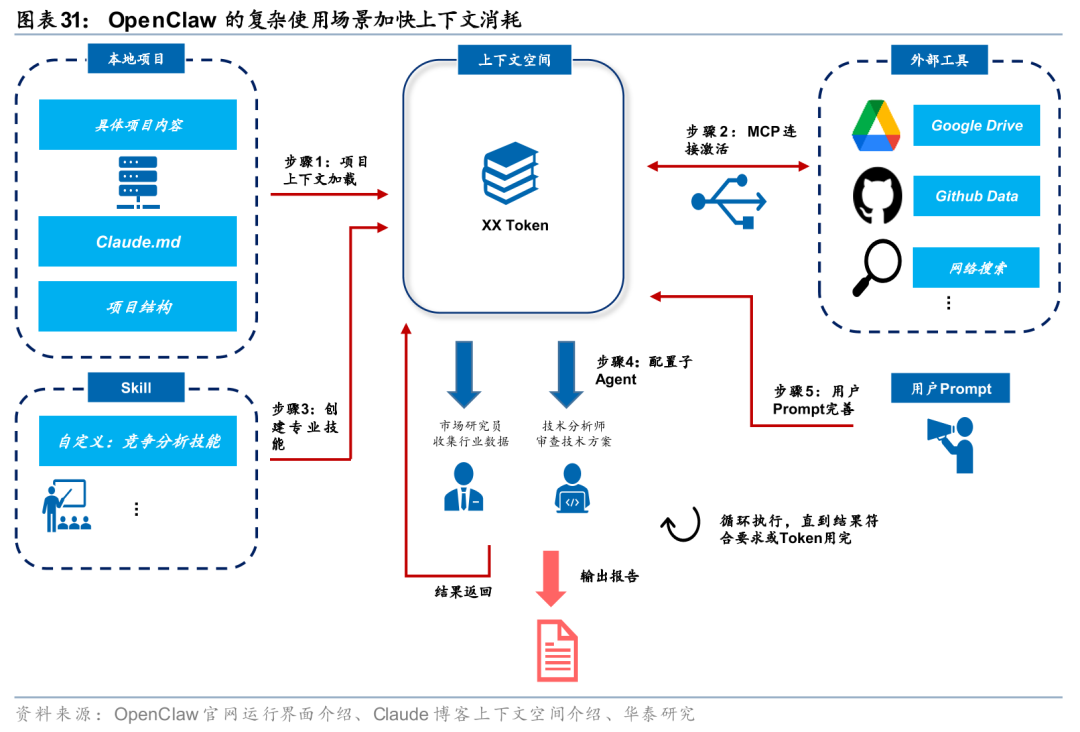 OpenClaw的复杂使用场景增加上下文消耗。OpenClaw能执行更复杂的任务,执行能力的提升部分源于更多的Skill调用和MCP外部工具连接,任务背景包含本地项目、云环境内容,复杂性则体现为更长的任务链路和多轮Prompt调试。在当前模型框架中,这些内容都将作为上下文传递给模型,长上下文将直接导致Token量的增加。此外,当任务上下文到达上限的时候,模型将调用压缩工具压缩上下文然后重新调用,进一步增加了调用次数。