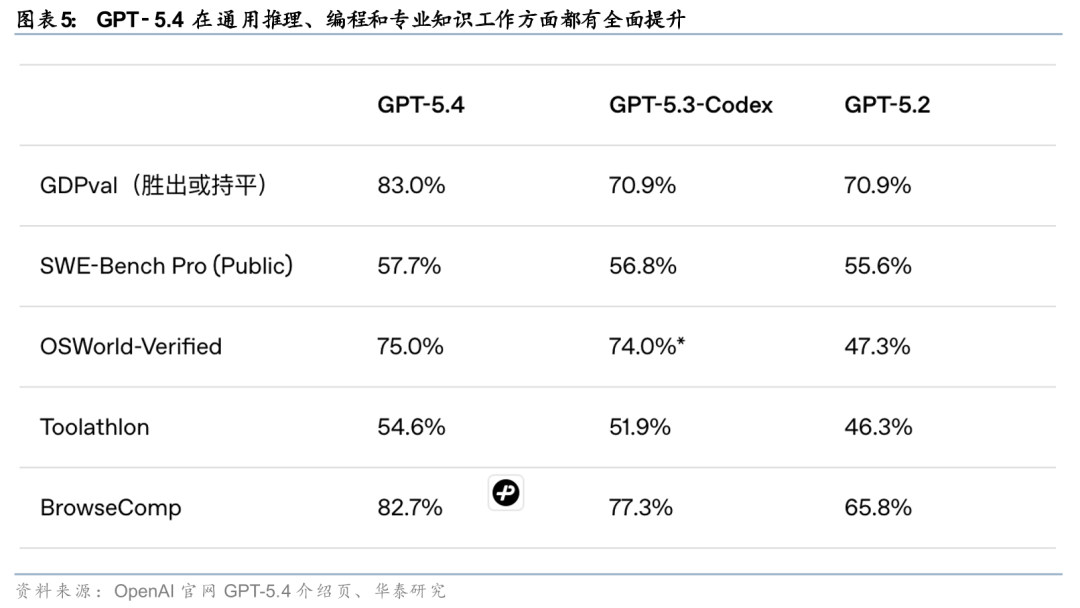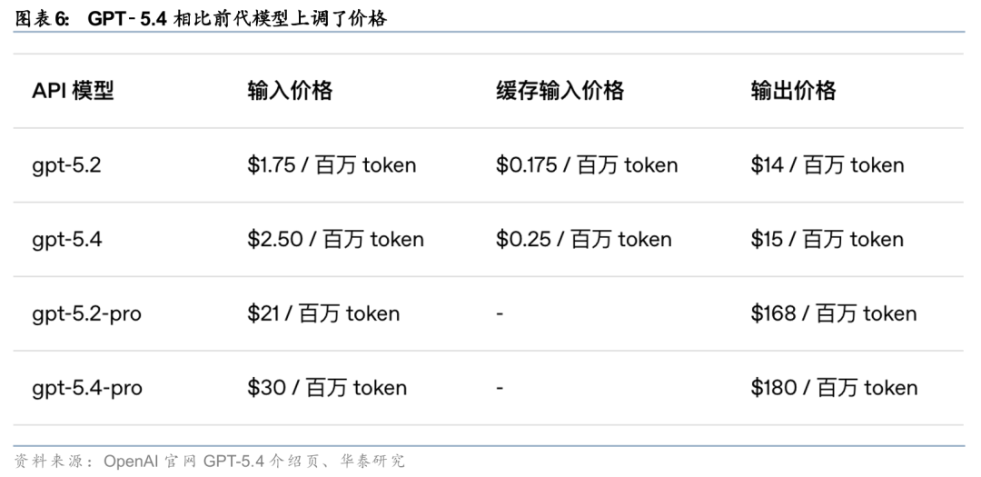 GPT-5.4在能力升级的同时也同步上调了API定价,反映出OpenAI正尝试以更强性能和更高Token效率支撑商业化提价。据OpenAI官方页面,GPT-5.4标准版API输入价格由GPT-5.2的$1.75/百万token升至$2.50/百万token,缓存输入价格由$0.175升至$0.25,输出价格由$14升至$15;Pro版输入价格则由$21升至$30,输出价格由$168升至$180。与此同时,OpenAI强调,GPT-5.4是其当前Token效率较高的推理模型,相较GPT-5.2完成相同问题所需Token数显著减少,因此单价上升并不必然对应实际任务成本按比例抬升。我们认为,GPT-5.4此次定价调整体现出OpenAI对高性能专业工作流场景的商业化兑现意图正在增强。