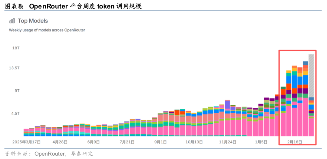 伴随OpenClaw等Agent工具的快速传播,Token消耗斜率加速提升。OpenClaw的快速出圈并非单一产品事件,而更多反映了通用Agent在产品形态和应用生态上的阶段性成熟。Agent对应的是连续任务执行,需要在规划、调用工具、读取环境、回写结果、再次规划的闭环中反复调用模型,因此token消耗不再是线性增加,而更接近随任务复杂度成倍放大。根据我们估计,OpenClaw轻度用户(查资料、简单文件整理)日均token消耗量在100w左右,日常办公场景(高频对话、基础工作自动化)日均token消耗量在500w左右,而重度用户(专业开发、复杂任务)日均token消耗量在2000w左右。根据OpenRouter平台最新数,周度token调用规模至约16 trillion token左右,2个月的时间增长2.5倍以上。根据OpenClaw 3月10日在Reddit披露,目前OpenClaw在OpenRouter平台的日均调用量在600B左右,约占OpenRouter总调用量的28%,占比迅速提升。