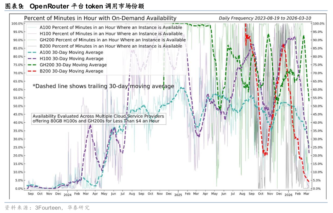 Token激增推动算力租赁市场进入新一轮涨价周期。截至2月底,英伟达高端GPU租赁价格较上月普遍上涨15%-30%,其中H200和H100型号涨幅最为显著,已成为本轮涨价的核心焦点。同时,根据3Fourteen数据,由于模型API Token调用需求的激增,各类GPU即时租赁的供应降至新低。我们认为,类Claw生态的Agent产品加速渗透有望推动推理需求进一步释放,并持续提振算力侧景气度。
