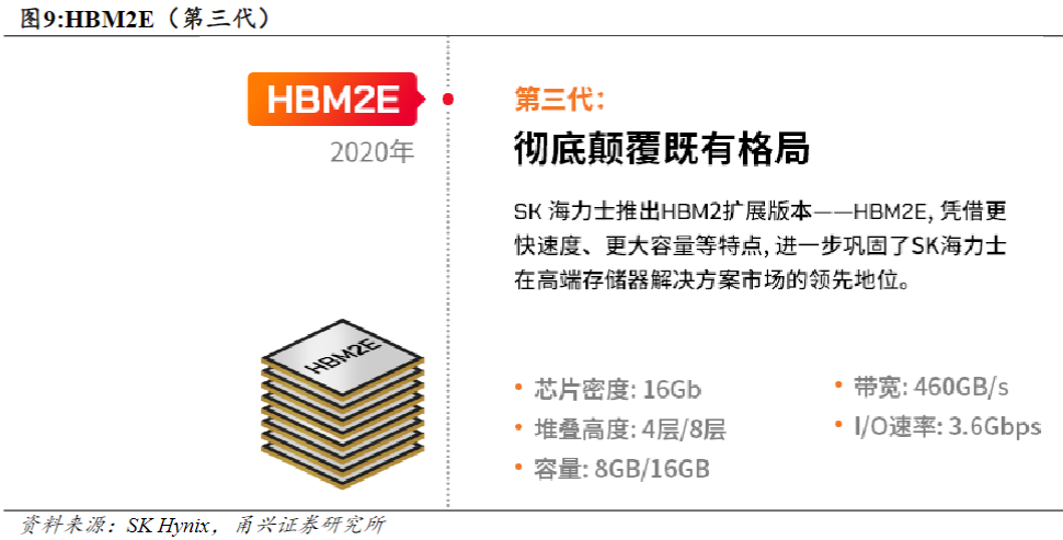 HBM2E垂直堆叠8个16Gb芯片,容量为16GB,是HBM2的两倍。处理速度达3.6Gbps,每秒可处理460GB的数据,是当时业界最快的存储器解决方案。
