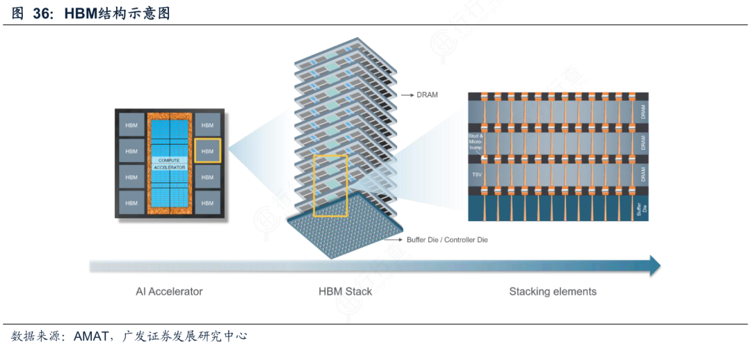 HBM的整体架构通过“主机芯片→逻辑芯片→硅中介层→DRAM堆叠体”的层级实现数据高速传输。HBM的垂直集成架构替代了传统的水平扩展,在优化空间占用的同时突破带宽瓶颈,是“超越摩尔定律”的核心落地方向之一。