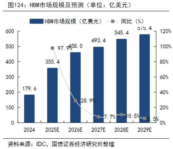 根据IDC披露数据,2024年全球HBM市场规模为179.62亿美元,受益于全球AI芯片对HBM的需求,预计2025、2026年需求加速增长,2024-2026年的年均复合增速约为60%。远期来看,IDC预计2029年全球HBM市场规模将达到575.4亿美元。